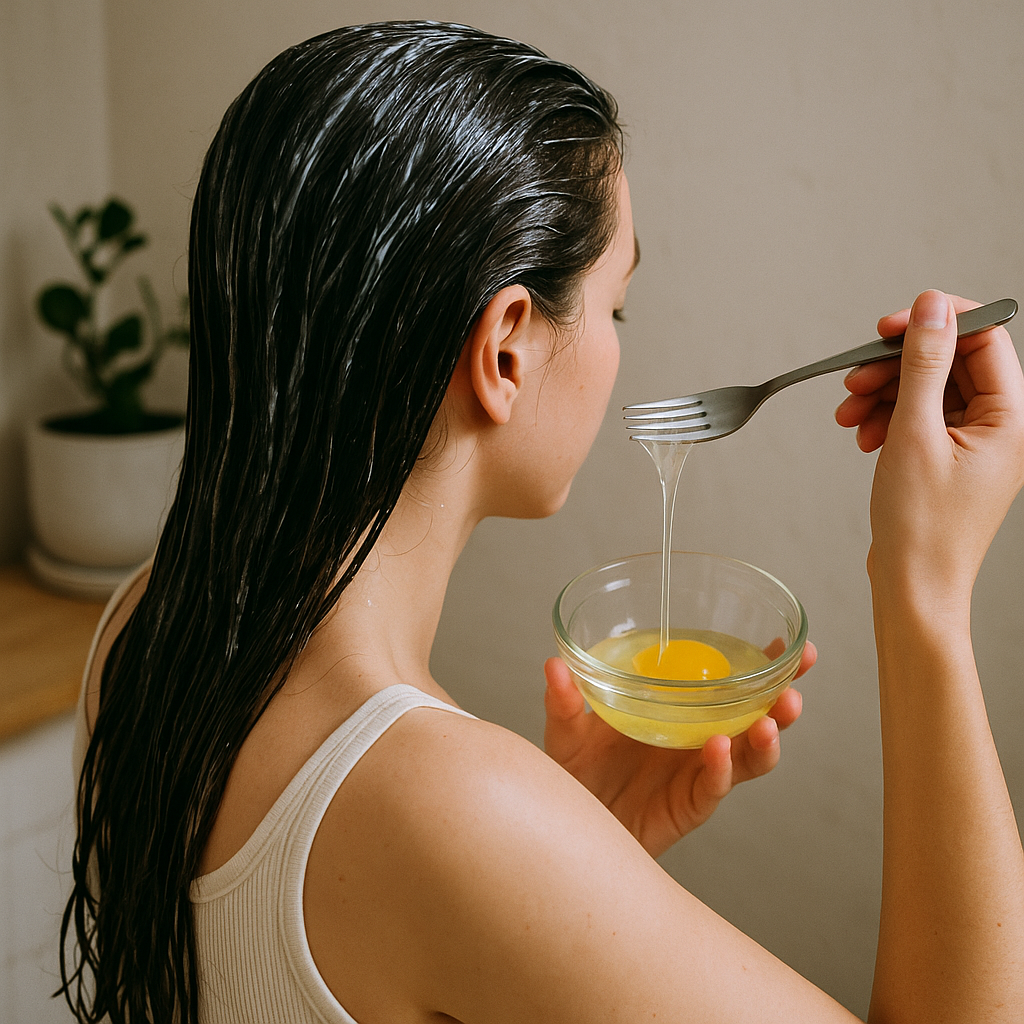 Lòng trắng trứng gà cung cấp vitamin A, B12 và D làm tóc chắc khoẻ hơn cũng như kích thích mọc tóc. Bạn nên trộn lòng trắng trứng gà với dầu dừa hoặc mật ong để tăng cường dưỡng chất và làm mặt nạ ủ tóc trong 15 phút. Trước khi ủ tốt nhất nên tráng qua bằng nước để tóc bớt bụi bẩn.